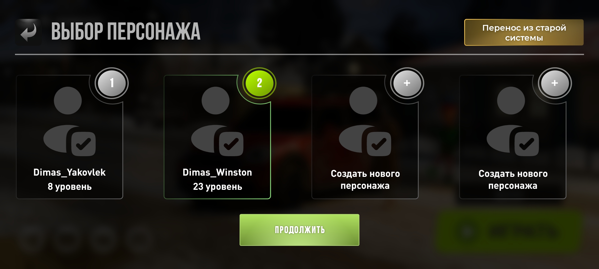 6. Скриншот выбора персонажа при входе на сервер: ниже