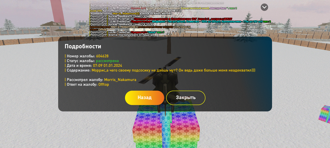 5. Суть жалобы:Моррис обиделся на меня ещё с прошлой ночи,но у него есть его замечательный дружочек Den_Dekaprio который как раз таки со мной и общался в вип чате, но мут получил только я. Ведь злостно нарушил правила не разу не проронив матное слово в разговоре. Проведите строгую беседу потому что у мальчика отношение к игрокам как к говну. Это подтверждается скринами ниже. Примерно за день - два до перевода он общается с игроком на посту хелпера.
