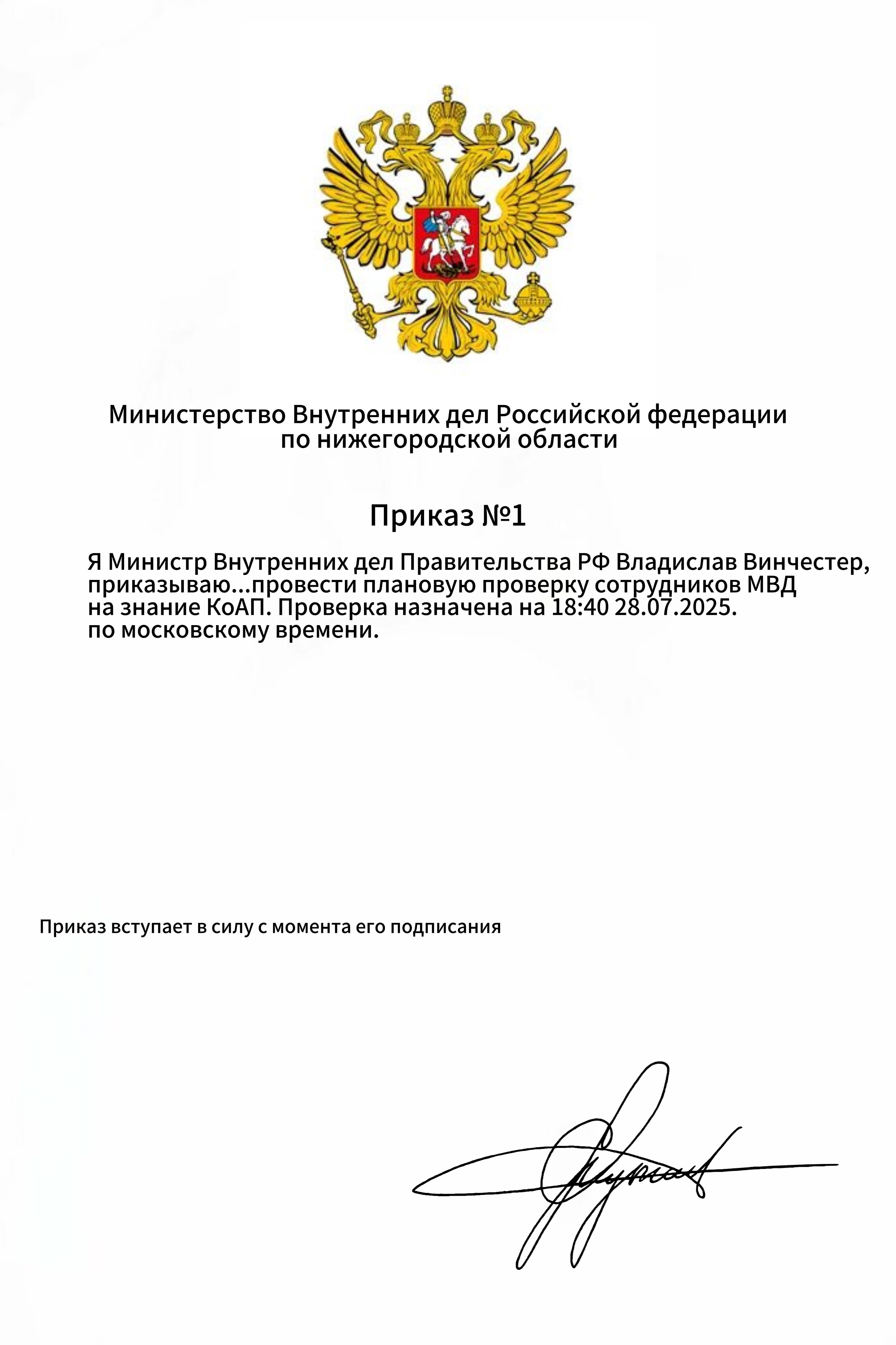 Я, министр внутренних дел, Дионис Торнадович, назначаю плановую проверку ГИБДД г. Южный. В ходе мероприятия будет проверено: готовность сотрудников, знание УК РФ, знание ФЗоП, знание КоАП, знание устава, знание регламента осуществления деятельности инспектора ДПС, проверка состояния транспорта, проверка снаряжения.
