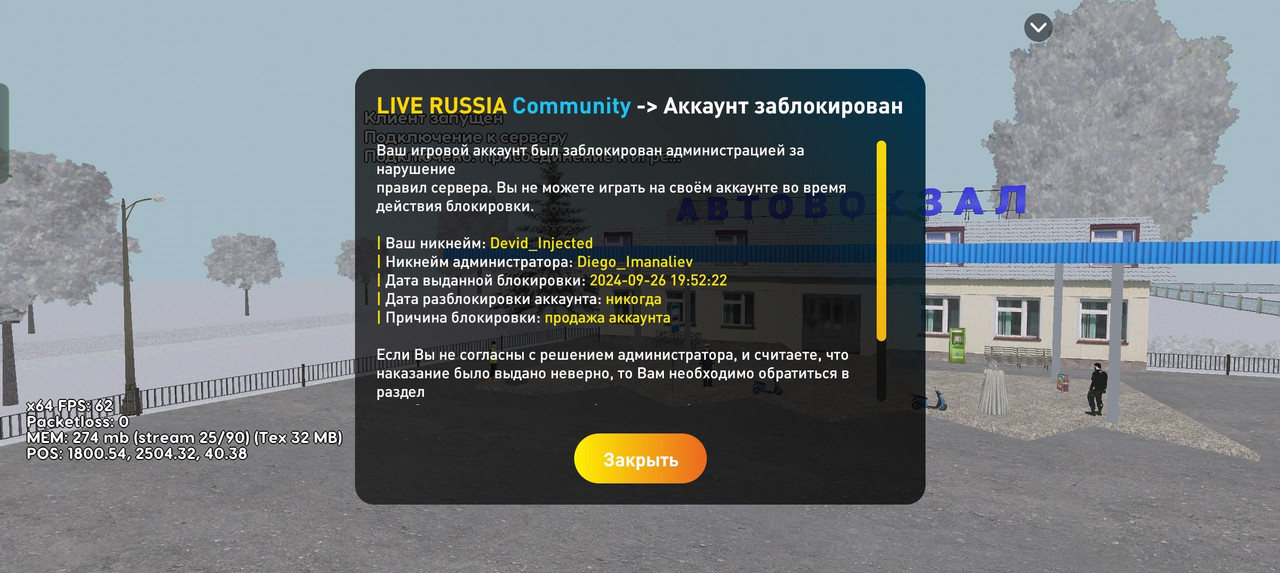 - Причина наказания: Продажа аккаунта