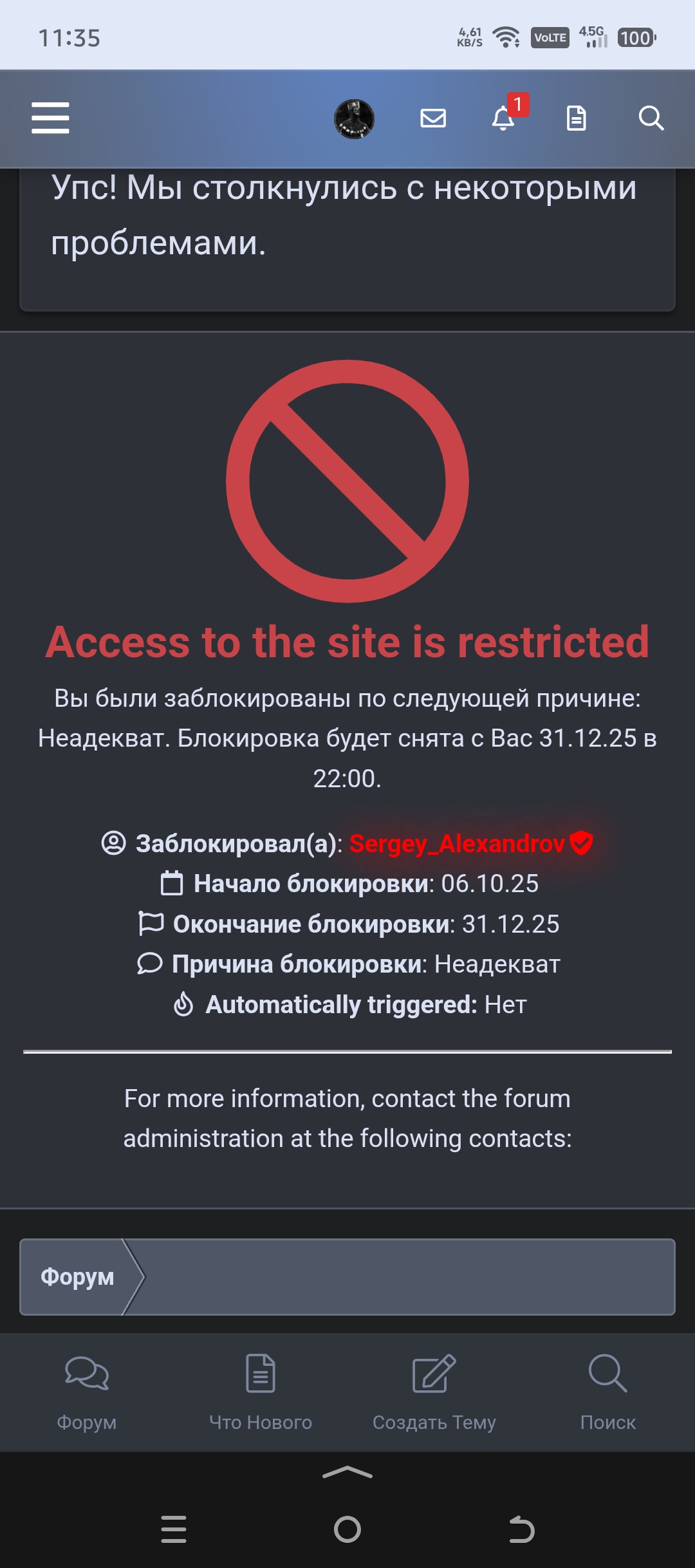 - Суть жалобы: Здравствуйте. Я не согласен с решением администратора Sergey_Alexandrov в виде блокировки ф/а на 3 месяца. Мне совершенно не понятно, что администратор увидел в нашем конфликте с другим человеком настолько ужасного чтобы выдать бан на 90 дней. Я активный игрок и без основного форумника крайне неудобно, + 3 месяца это очень большой срок. Мне интересно возможно ли снизить данный срок наказания?